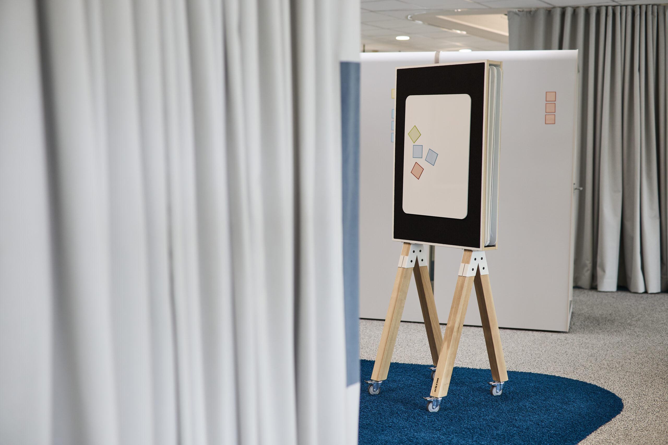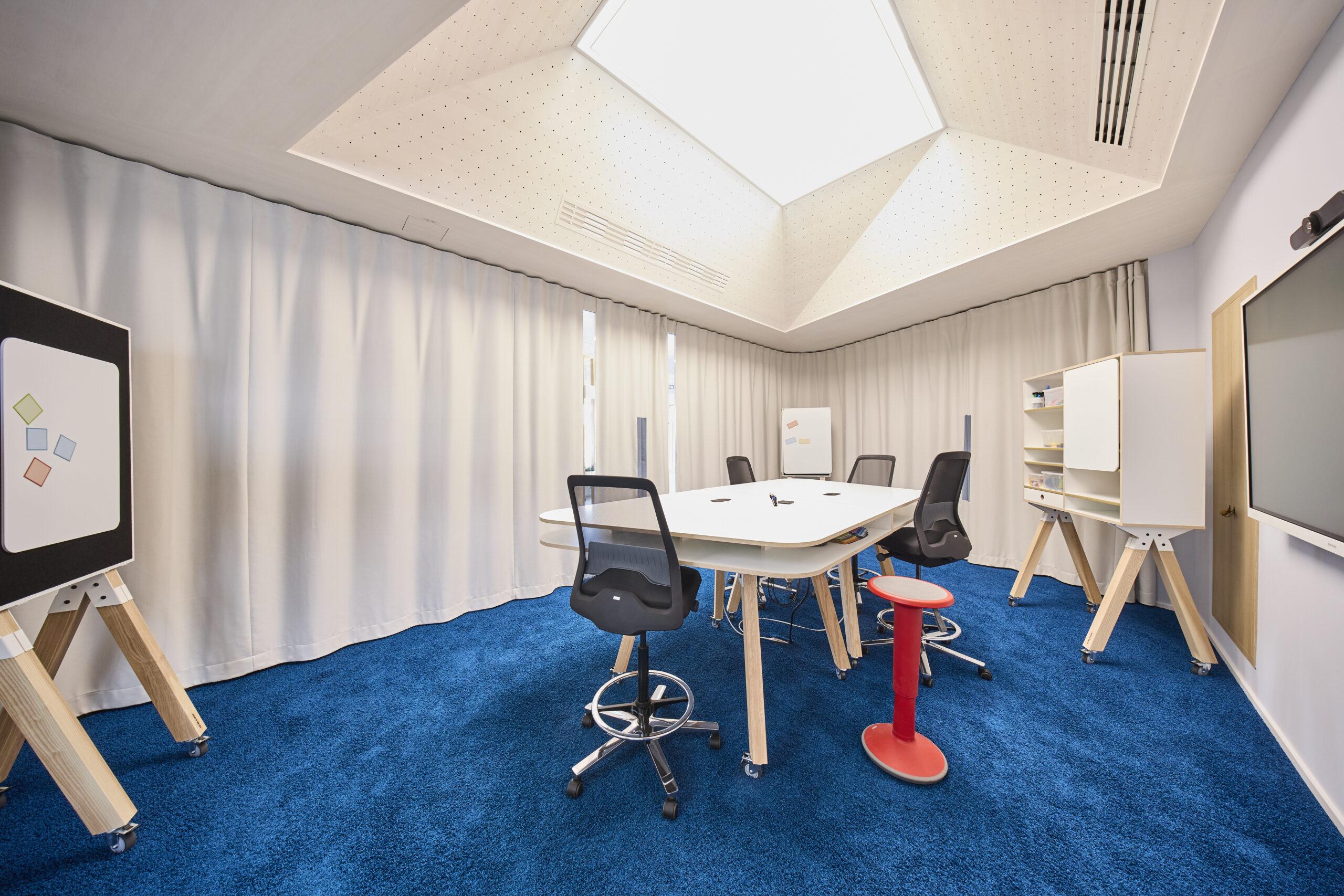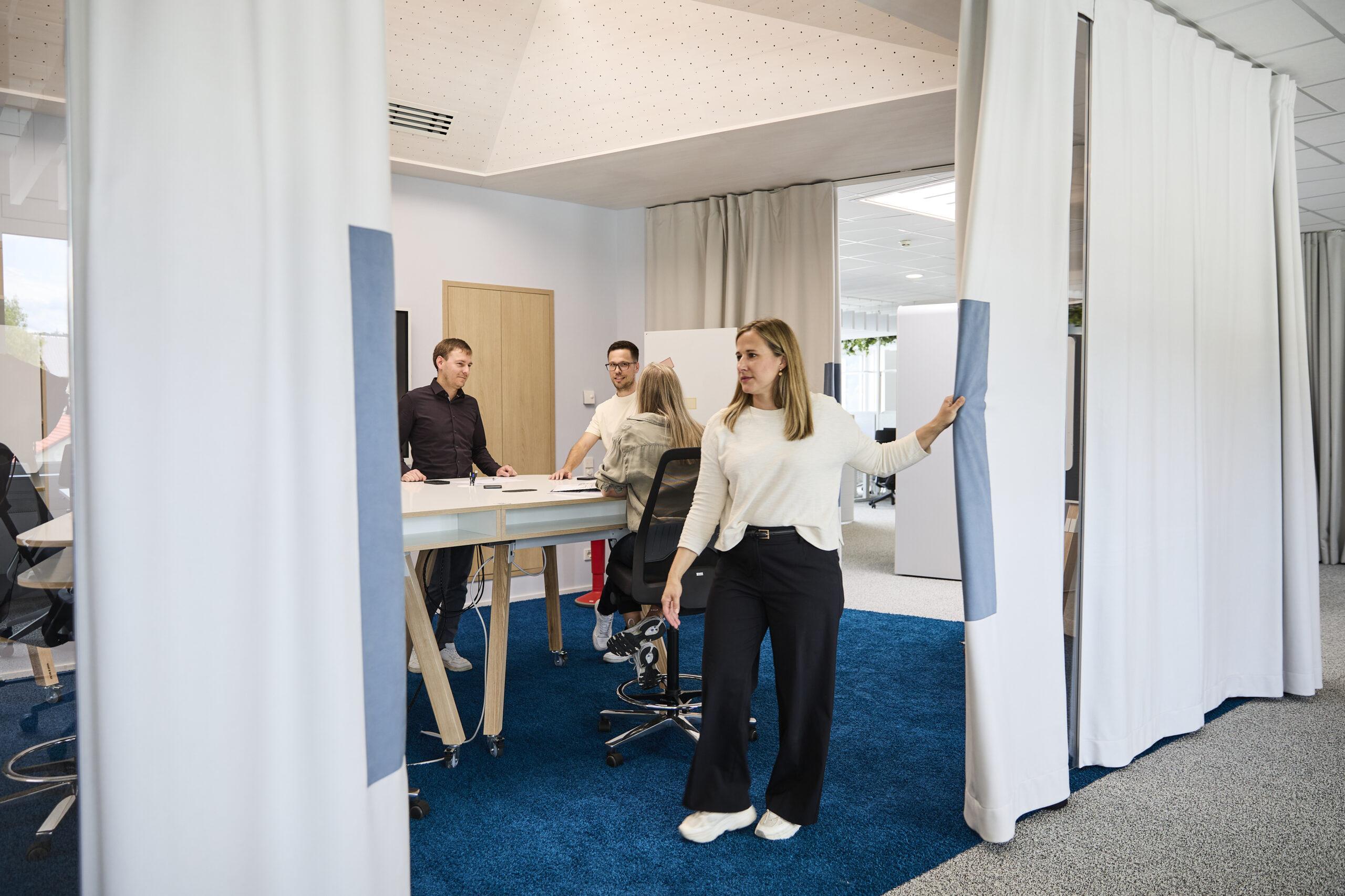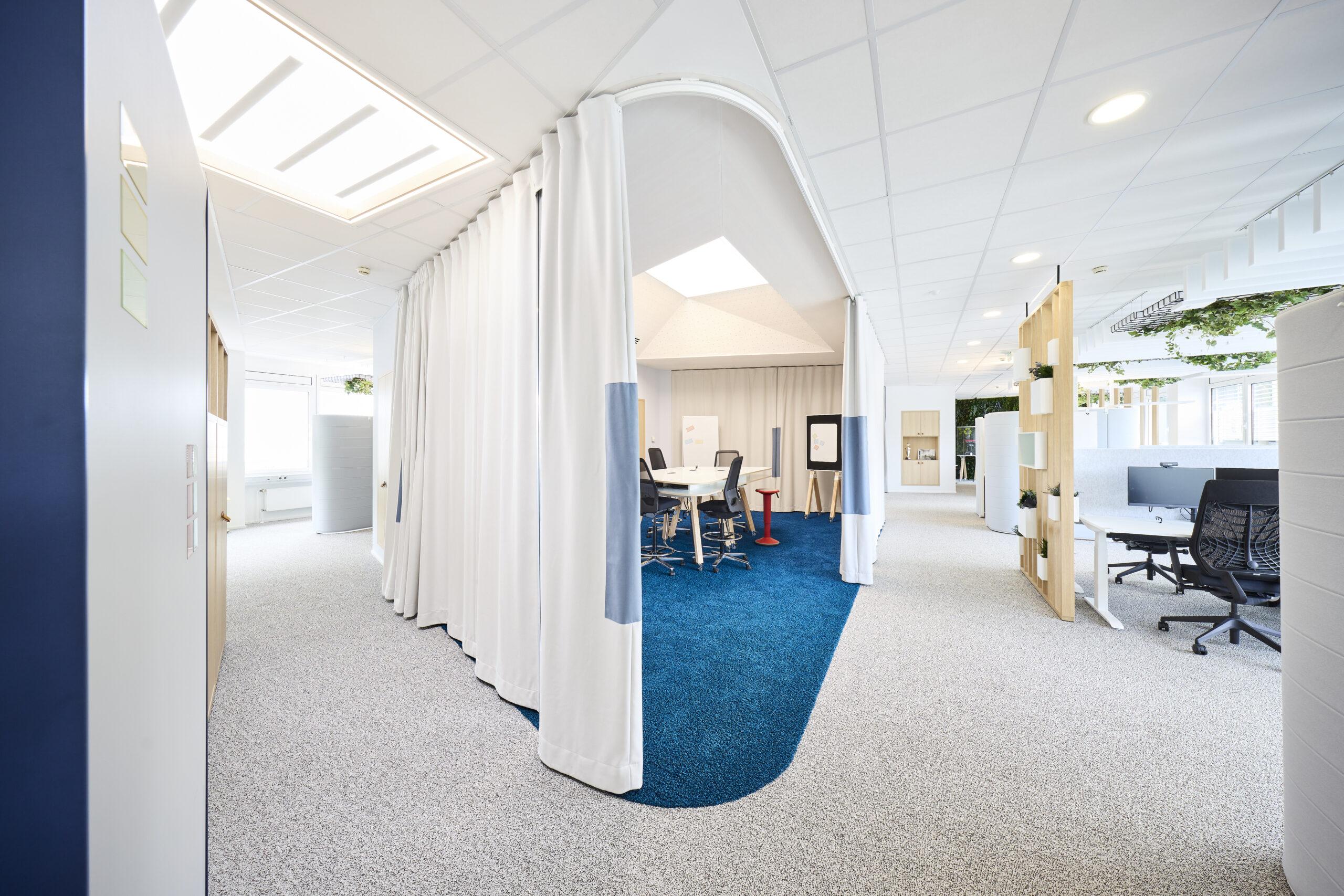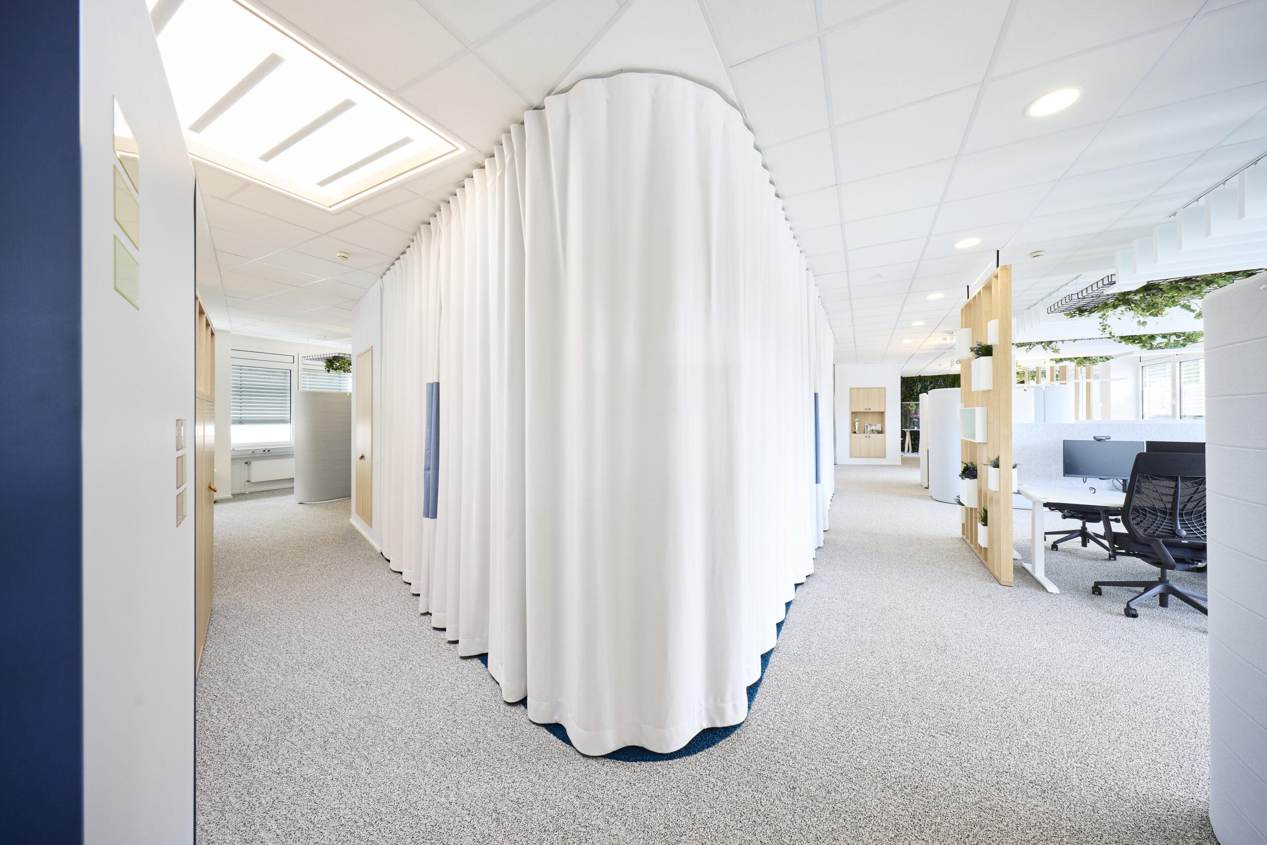 Der Vorhang wird über das TRUMPF 95 Schienensystem geführt, das in gebogener Form sowohl motorisch als auch manuell bewegt werden kann. So lässt sich der Besprechungsbereich je nach Nutzungssituation akustisch und optisch abtrennen oder vollständig in den offenen Raum integrieren.
