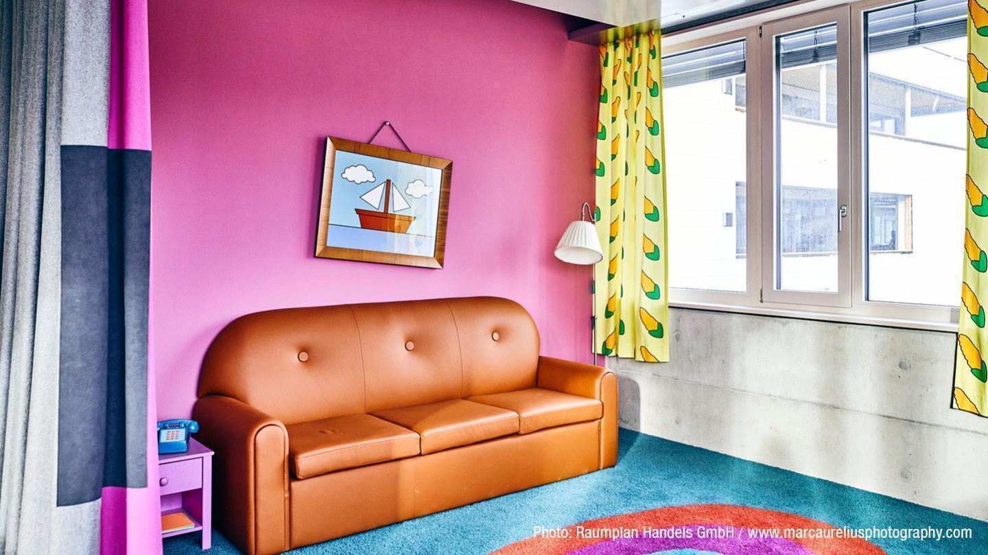 - Außenlagen aus WOOLSERGE OFFICE, mitunter in den Sonderfarben passend zum Raumthema “Die Simpsons”